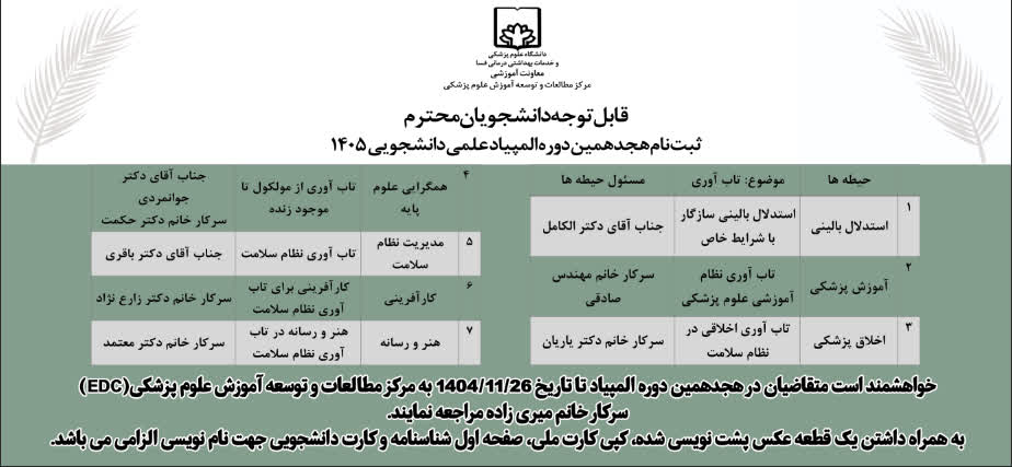 متقاضیان این دوره المپیاد تا تاریخ 26/ 11/ 1404 به مرکز مطالعات و توسعه آموزش علوم پزشکی (EDC) به سرکار خانم میری زاده  مراجعه نماید.